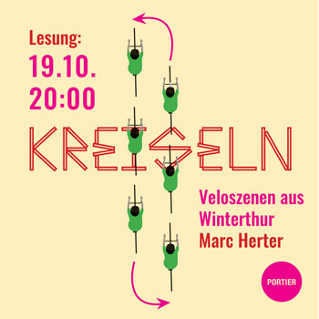 Wildschweine, ausgepumpte Polizisten, pinkelnde Gümmeler und Diebe. Schräge Gestalten säumen Marc Herters Geschichten über das Leben und das Velofahren. Der Autor und Velokurier gibt einigen dieser Figuren im Portier eine Bühne und liest aus seinem ersten Buch «kreiseln», in dem all seine Velokolumnen versammelt sind, die er in den vergangenen Jahren für das Kulturmagazin Coucou geschrieben hat.